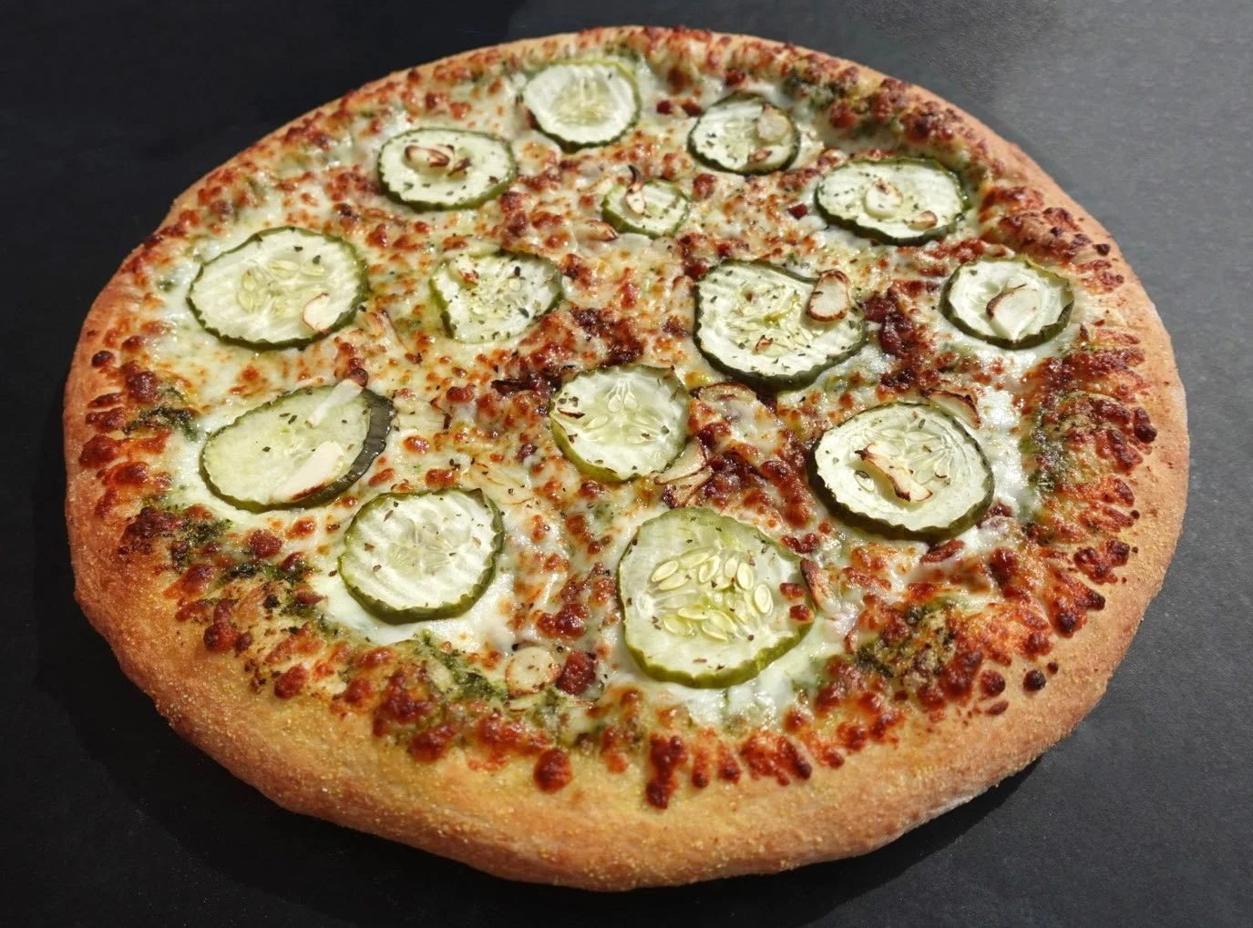 (pesto) / bacon / pickles / fresh garlic / extra mozzarella