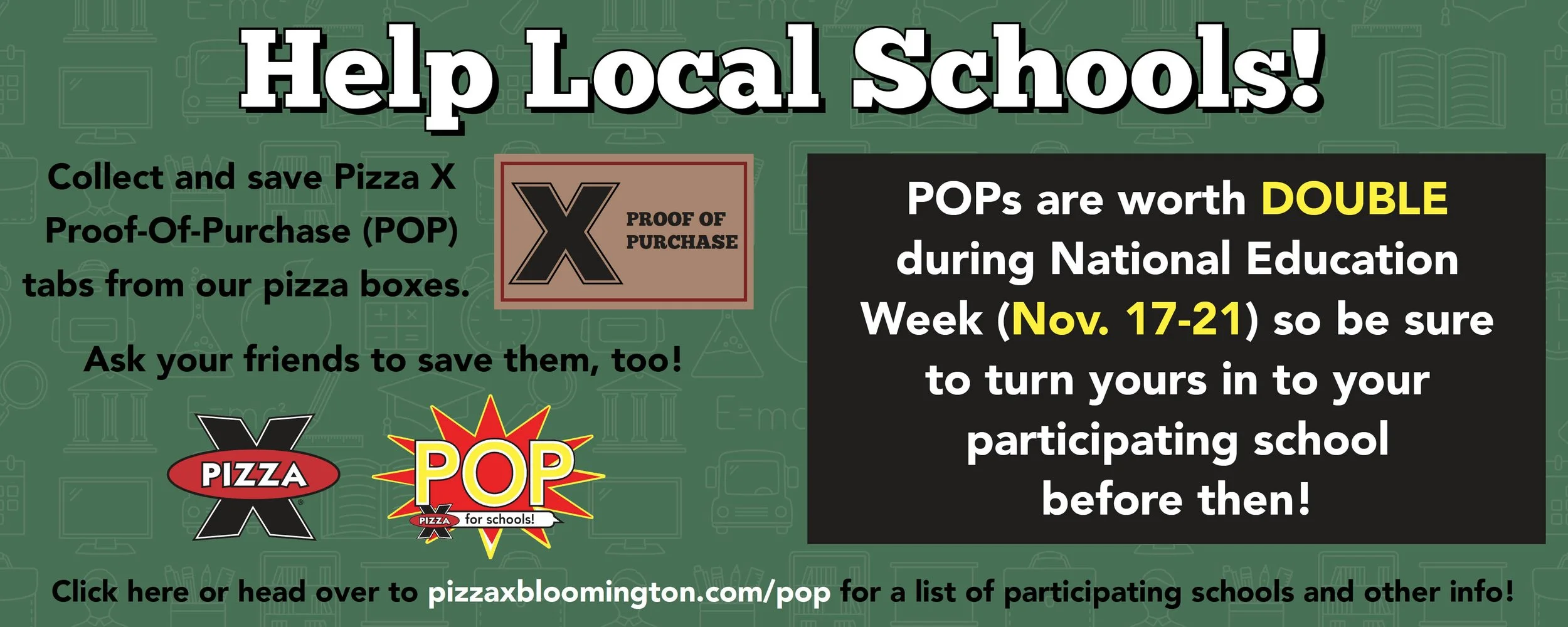 Collect and save Pizza X Proof-Of-Purchase (POP) tabs from our pizza boxes. Ask your friends to save them, too! Each Proof-of-Purchase tab is worth 25 cents. We encourage you to collect POP tabs all year and redeem them during National Education Week (week prior to Thanksgiving every year) when they are worth double (50 cents).